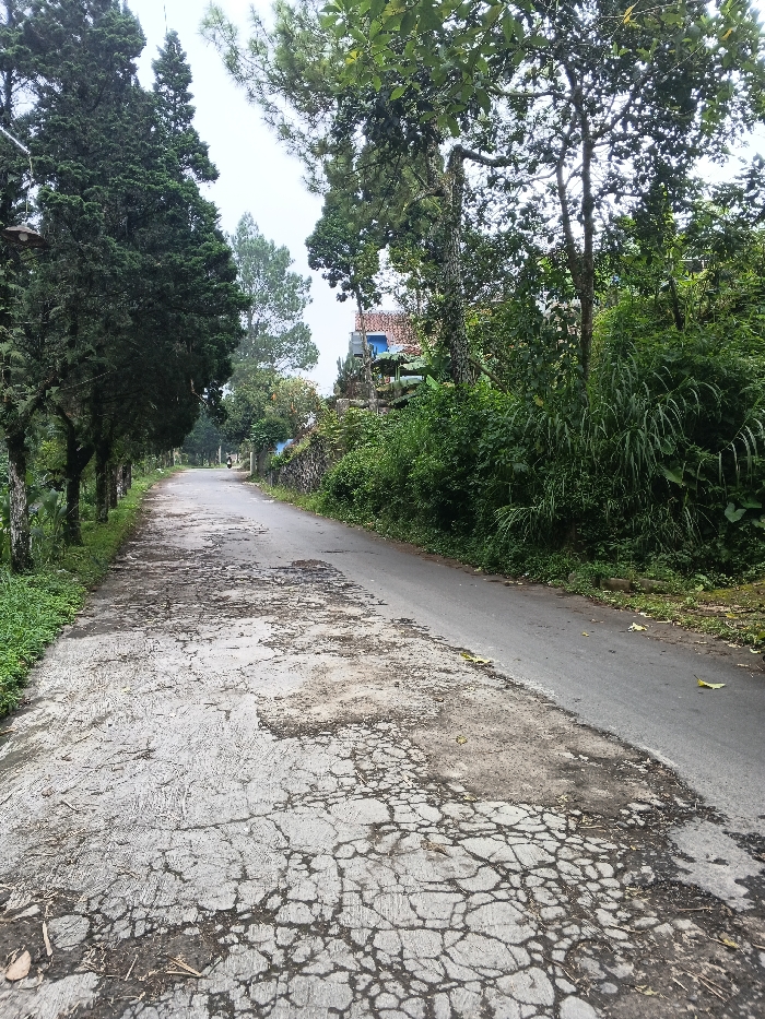 This image displays a rural road segment located in Candelaria, Philippines, under an overcast sky. The road is bifurcated longitudinally, presenting two distinct surfaces. The left side consists of a concrete pathway, heavily degraded with extensive cracking, spalling, and visible aggregate. The right side is an asphalt road, appearing smoother and less deteriorated than the concrete section. Along the left margin of the concrete path, a line of tall, slender evergreen trees with dark foliage stands, bordering an area of green grass and smaller plants. A dark, possibly metallic, hanging light fixture or object is visible on the far left, suspended from one of these trees. The right side of the asphalt road is bordered by a dense wall of diverse green vegetation, comprising trees, shrubs, and undergrowth. A stone wall is partially visible beneath this dense foliage. In the mid-distance, behind the vegetation, a building with a blue upper facade and a terracotta-colored roof is partially discernible. In the far distance, on the asphalt road, a single dark-colored motorcycle or scooter with one rider is observed, oriented away from the viewer. No other individuals or active interactions are present in the scene.