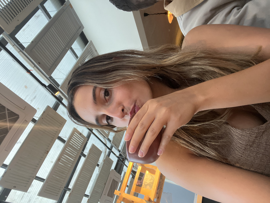 The image captures a young adult female from the chest up, positioned slightly to the left of the frame's center. She has light brown hair, parted on her left, extending over her shoulders. She is holding a dark brown, rounded cup to her lips, appearing to sip from it with her lips slightly puckered, and is looking directly at the viewer. A silver-colored ring is visible on the ring finger of her right hand, which holds the cup. She wears a light brown, sleeveless top with a textured or ruched fabric. To her right, the upper shoulder and a portion of the head of another individual, likely male, are visible, wearing a light-colored collared garment. The scene is set in an indoor commercial establishment, consistent with a modern cafe or restaurant, located within the civil parish of Lordelo do Ouro e Massarelos, Porto, Portugal. The ceiling features multiple white rectangular louvered grilles, likely ventilation diffusers, interspersed with clear or translucent corrugated roof panels that allow natural light into the space. Black metal structural elements and cylindrical spotlights are also visible on the ceiling. To the left of the woman, a prominent yellow-orange wooden slat or lattice structure is present, which includes a reflective panel showing a distorted reflection of a person. The environment is brightly lit, suggesting ample natural and artificial illumination.