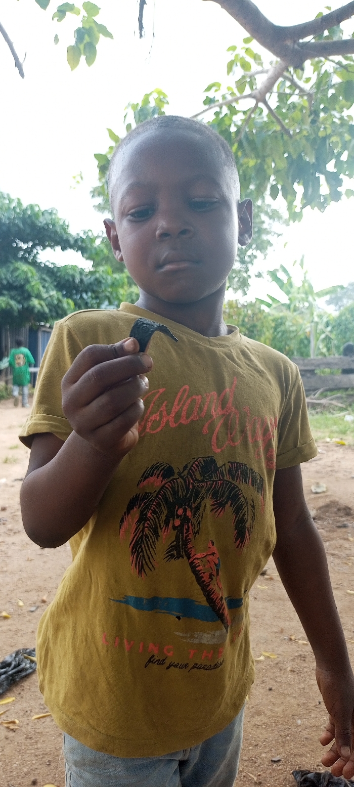 A young male, approximately 6-9 years old, stands outdoors in Adankolo, Nigeria, holding a small, dark, irregularly shaped object in his left hand