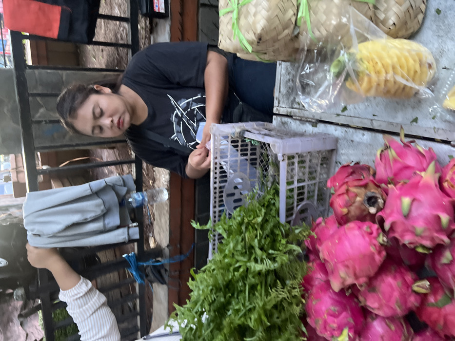 An outdoor market stall scene in Kecamatan Pati, Indonesia, features a seated female vendor and various produce. The vendor, an adult female with dark hair, wears a black short-sleeved t-shirt with a white graphic and a dark apron, and is seen manipulating a small white item with both hands. In the foreground, a wooden surface displays a large pile of vibrant pink dragon fruit. To the right of the dragon fruit, a white plastic crate contains bundles of green leafy vegetables. Further right, a clear plastic bag holds several slices of peeled pineapple, positioned in front of two woven bamboo containers secured with green string. Behind the vendor, a black metal railing supports a grey hooded jacket and a clear plastic water bottle attached with blue material. A partial view of another person's arm, wearing a striped sleeve, is visible on the far left, near the railing. The background is blurred, showing additional outdoor elements like concrete structures and foliage.