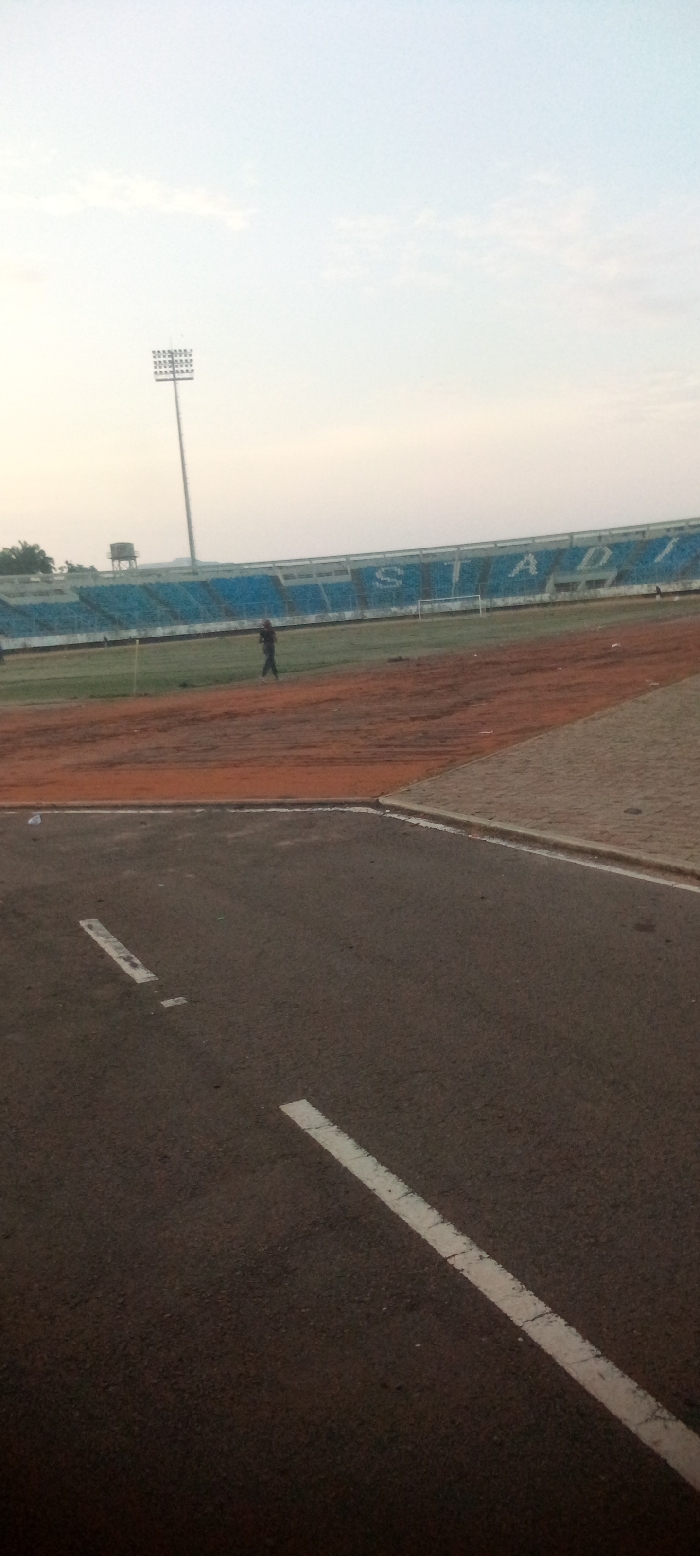 The image depicts a sports stadium scene in Adankolo, Nigeria, under a pale, overcast sky