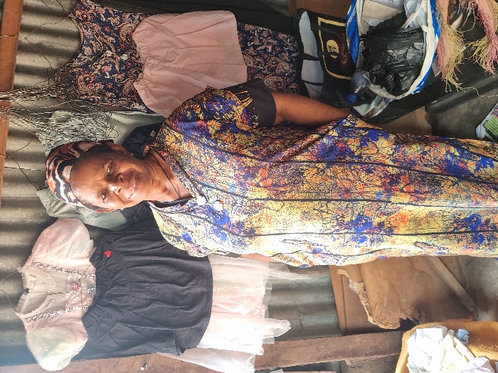 An adult female stands smiling, centered in a market stall in Fegge, Nigeria, with clothing items displayed on a corrugated metal wall behind her