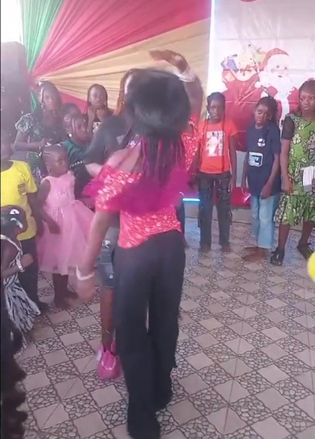 two women dancing to music in what appears to be an indoor event space. There are several children and adults standing around watching. The woman in the foreground has on black pants, a floral print top, and is wearing a black fur hat with purple accents in her hair. The second woman is wearing jean shorts, a black t-shirt, and pink sneakers. They are holding each other and dancing in a circle. The floor is made of patterned ceramic tiles. In the background is a banner that reads “DAAHKOLE ANGEL'S MULTI PURPOSE EVENT”, and there is red and green party decorations. There is a yellow balloon that has floated to the floor, and some of the children seem to have interest in it.