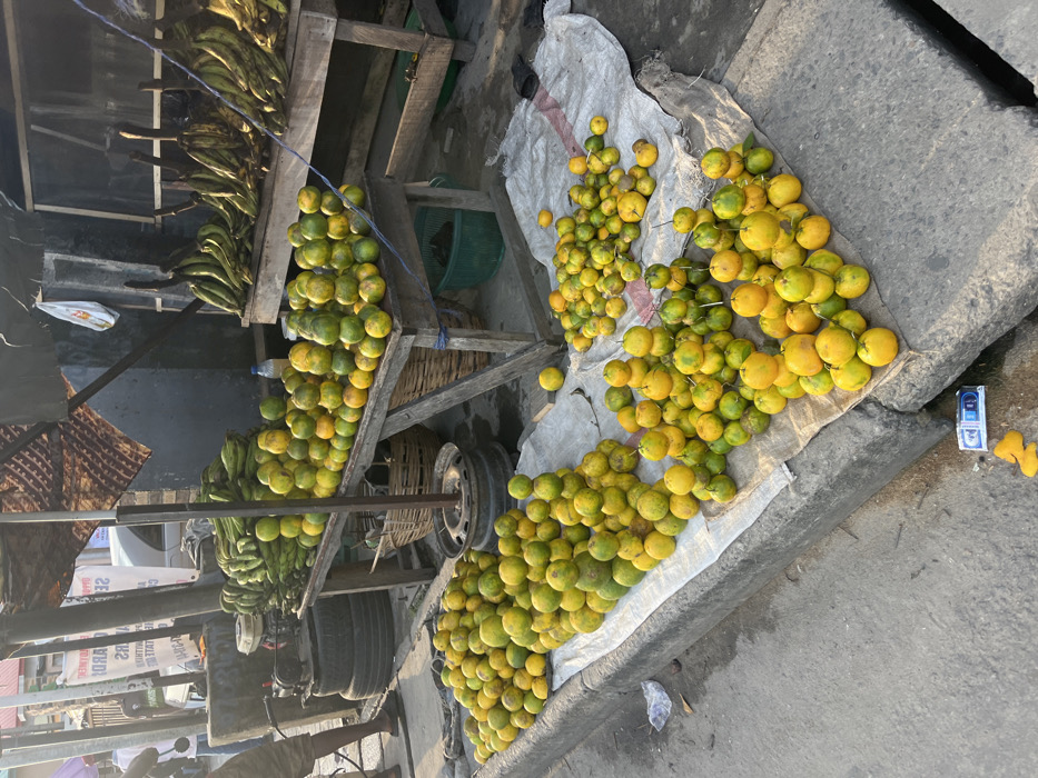 This image depicts an outdoor fruit vendor's display situated in the city of Ado, Nigeria, under daytime illumination