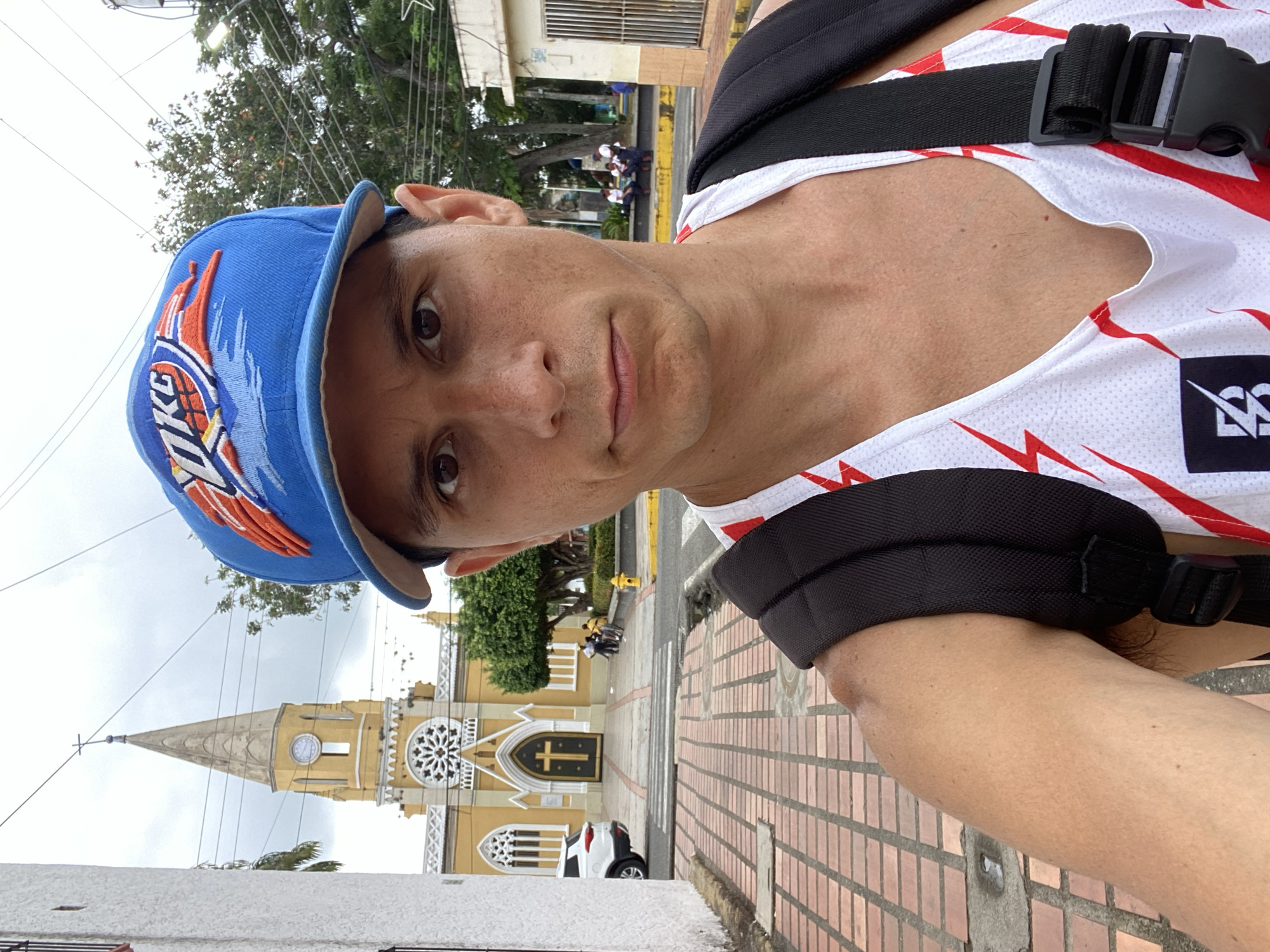 A male individual is positioned in the foreground, facing the camera with a neutral expression. He wears a light blue baseball cap with an "OKC" logo and a basketball graphic, a white sleeveless tank top featuring red lightning bolt patterns and a black logo on the left chest, and a black backpack. A scar or blemish is visible on his right shoulder. He is standing on a reddish-brown brick-patterned sidewalk, with a white building wall partially visible on the far left. In the midground, directly behind the individual, stands the San José de Barlovento Church in San José de Barlovento, Venezuela. The church is painted yellow and white, featuring a tall, pointed spire topped with a cross, and a clock visible on the tower below the spire. Its facade displays a large circular rose window design above the main entrance, which consists of double doors marked with a cross. A paved area extends from the church entrance to a street. A white SUV is parked on the street to the left of the church. To the right of the church and across the street, a public plaza or park area is visible, characterized by green trees and benches. Several indistinct individuals are seated or standing in this area, with two figures closer to the street, one wearing a yellow shirt. A yellow fire hydrant is positioned near the curb in front of the park. Overhead power lines crisscross the cloudy sky.