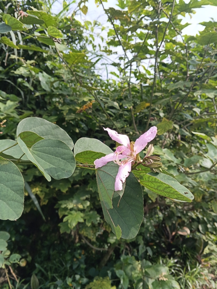 A close-up captures a Bauhinia flower in bloom, its delicate pink petals unfurling amidst broad, green leaves. The leaves are rounded and slightly lobed, indicative of the Bauhinia genus. Background vegetation provides a dense, green backdrop of various shrubs and trees. Sunlight filters through the foliage, highlighting the flower and leaves, contrasting textures and hues in the natural setting.
