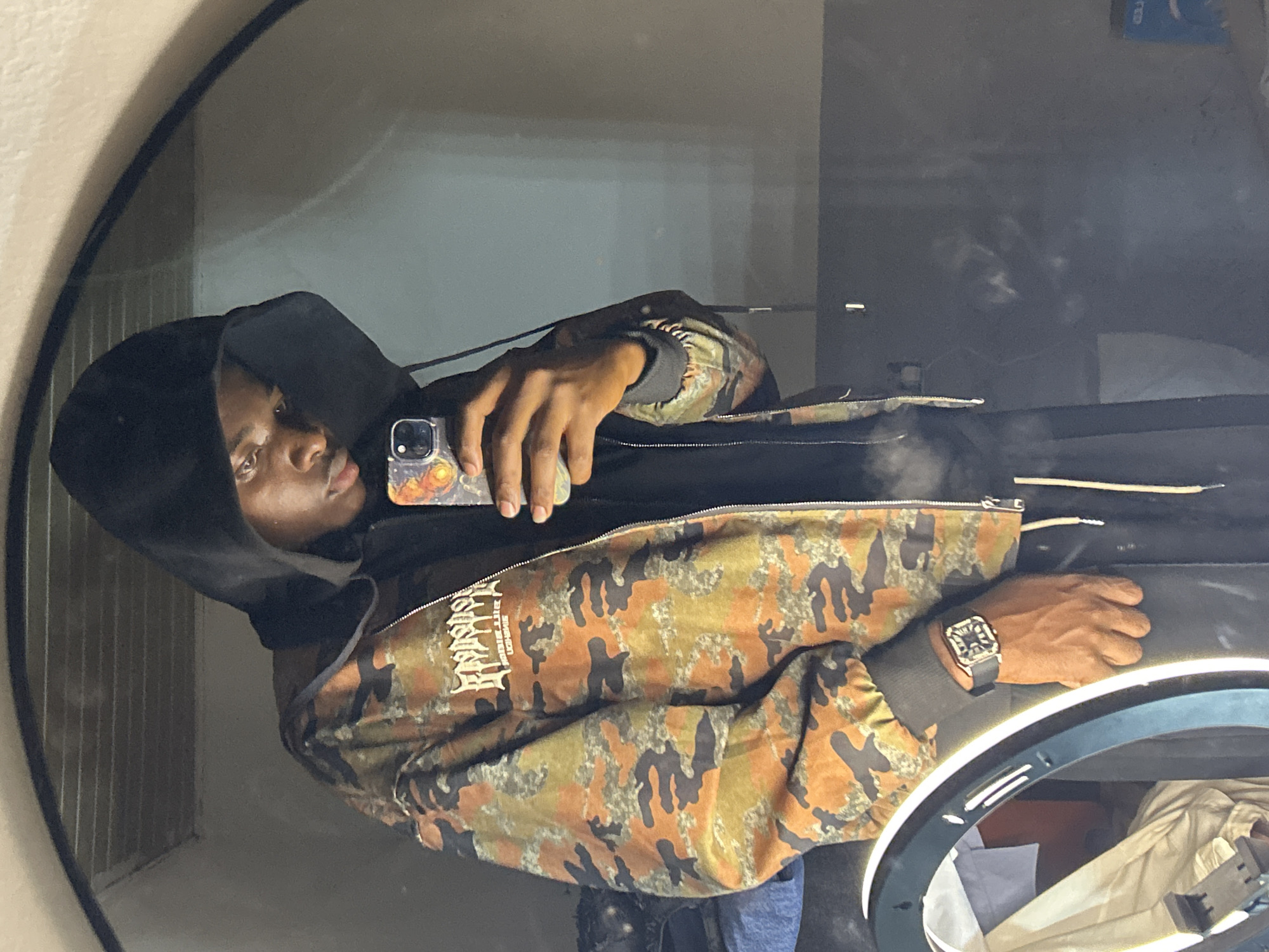 A single individual is depicted in a mirror selfie within an indoor setting. The location in the city of Kirana, Nigeria, cannot be determined from the visual evidence. The subject is a person with dark skin, wearing a black hooded sweatshirt under a camouflage-patterned zip-up jacket. The jacket features a white, stylized text graphic, likely "RADICAL" or similar, on the left chest. Black pants with white drawstrings are visible. A square-faced watch with a patterned face and a black band is worn on the left wrist. The individual is holding a smartphone with a dual-camera system and a distinctive colorful, swirling art-themed case (resembling "The Starry Night") in their right hand, using it to capture the reflection. The subject's head is slightly tilted, and eyes are directed towards the phone/mirror. The environment reflects a room, likely a bedroom or personal space. The mirror has a black frame. Reflected in the background are a light-colored ceiling with dark strips, a plain light wall, and a dark floor. To the lower left, a portion of a circular ring light with a white inner rim is visible. Adjacent to the ring light, a light-colored garment is draped over an unseen object, and a blue cloth or object is nearby. Further right in the reflection, a blue box with white text is partially visible. Lighting appears to be artificial.