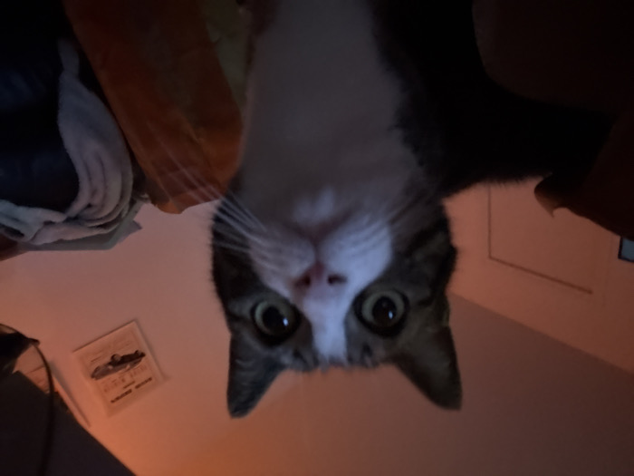 - "A domestic cat, exhibiting white fur on its muzzle and chest contrasting with tabby stripes on its head and back, stares directly upward with dilated pupils reflecting ambient light" by FM-0IRnE2, licensed under CC BY 4.0
