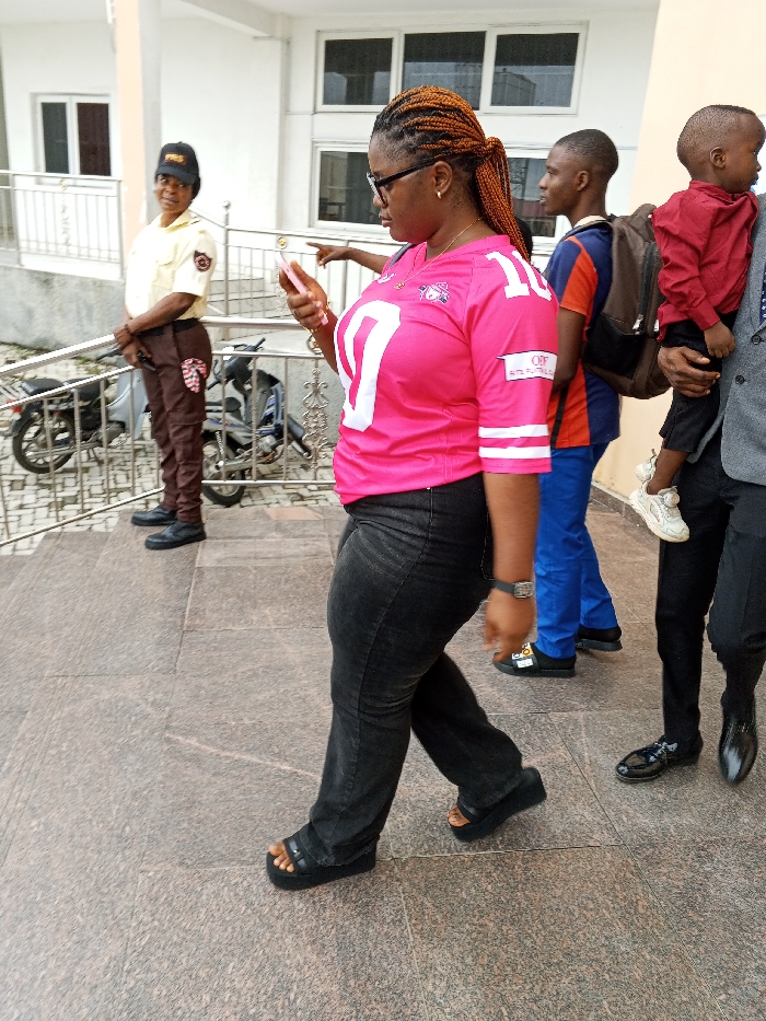 The image depicts an outdoor scene on a granite-tiled walkway outside a building in Lokoja, Nigeria. In the foreground, a female individual, estimated 25-35 years old, with orange braided hair pulled into a ponytail and wearing glasses, walks towards the right. She wears a hot pink short-sleeved American football-style jersey with a white "10" on the front and "OFF SITE PLATFORM" on the left sleeve, black flared jeans, and black platform sandals. A silver-toned wristwatch is on her left wrist. She holds a pink smartphone in her right hand, looking at the screen, and her left hand is raised with the index finger extended, pointing forward. To the left, behind a silver metallic railing on a lower level, a male security guard, estimated 40-55 years old, stands facing right. He wears a light brown short-sleeved uniform shirt with a dark emblem on the right sleeve, a dark cap with "PMS" lettering, dark brown pants, and black dress shoes. Two motorcycles, one silver and one black, are parked behind the railing. In the background, a white building with multiple rectangular windows is visible. To the right of the foreground female, a young male, estimated 20-30 years old, wearing a blue and orange short-sleeved shirt and blue pants, walks rightward carrying a brown backpack. Adjacent to him, a male, estimated 30-45 years old, dressed in a grey blazer over a dark top and dark pants, carries a young male child, estimated 2-4 years old, who is wearing a red long-sleeved shirt and white sneakers. All visible individuals are moving generally in the same direction, from left to right.