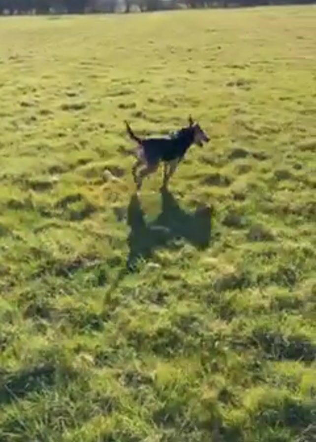 A dog runs through a grassy field on a sunny day. The dog is black with tan markings. The field is green, and the sky is blue. In the distance, there is a person walking. The camera follows the dog as it runs.