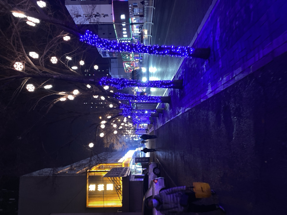 This image depicts a nighttime urban street scene in the city of Linghe, China. The perspective is from a sidewalk, looking down a street lined with deciduous trees adorned with festive lighting. On the immediate left, a dark asphalt sidewalk extends into the distance, appearing wet. A person in the foreground, facing away from the viewer, wears a light-colored puffer jacket, dark pants, and a white face mask, carrying a yellow bag in their left hand. Behind this individual, two light-colored sedans are parked parallel to the sidewalk. Further down the sidewalk, several indistinct figures are visible, walking away from the camera. To the right of the sidewalk, a row of trees with bare branches is heavily decorated. Their trunks are wrapped in bright blue string lights, casting a strong blue hue onto the adjacent paved path and the ground. White, snowflake-shaped lights hang from the upper branches of these trees. Beyond the trees and the blue-lit path is a multi-lane road, also appearing wet and reflective. Headlights from an oncoming vehicle are visible in the mid-distance. The road features a white barrier or railing separating it from the trees in some sections. Buildings line both sides of the street. On the far left, a multi-story building features a prominent section with vertical yellow-orange illuminated slats and what appear to be Chinese characters. Other buildings along the street display various illuminated signs and storefronts, contributing to the overall night ambiance. The sky above is dark.