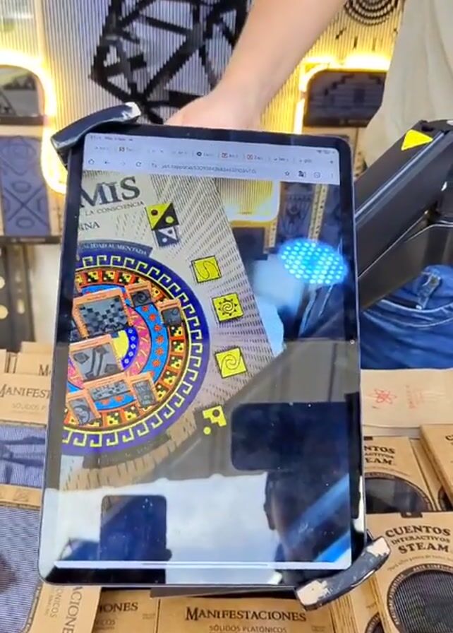 Here is a detailed description of the video: The video shows a person holding a black tablet with an image of a book displayed on the screen. The book's title is "HERMIS: Cuántica a la consciencia Andina" (HERMIS: Quantum to Andean consciousness). The book cover has a colorful circular design and several yellow symbols floating around it on the tablet screen. The person is holding the tablet over a table with boxes containing items, including "Sólidos Platónicos" (Platonic solids) and "Cuentos de Vapor STEAM" (STEAM Vapor Stories). In the background, there are textured patterns and a black geometric structure is visible. The lighting is bright, with the tablet's screen and surrounding objects well-illuminated.