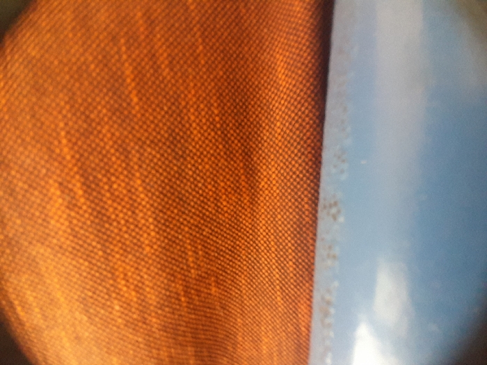 An extreme close-up reveals a tightly woven orange fabric with a distinct square pattern. The texture appears slightly wrinkled. Abutting the fabric on the right is a smooth, reflective light blue surface. Small dark specks are visible along the edge where the two materials meet. The composition suggests a stark contrast between the tactile textile and the hard, glossy surface. The lighting is uneven, casting shadows on the fabric.