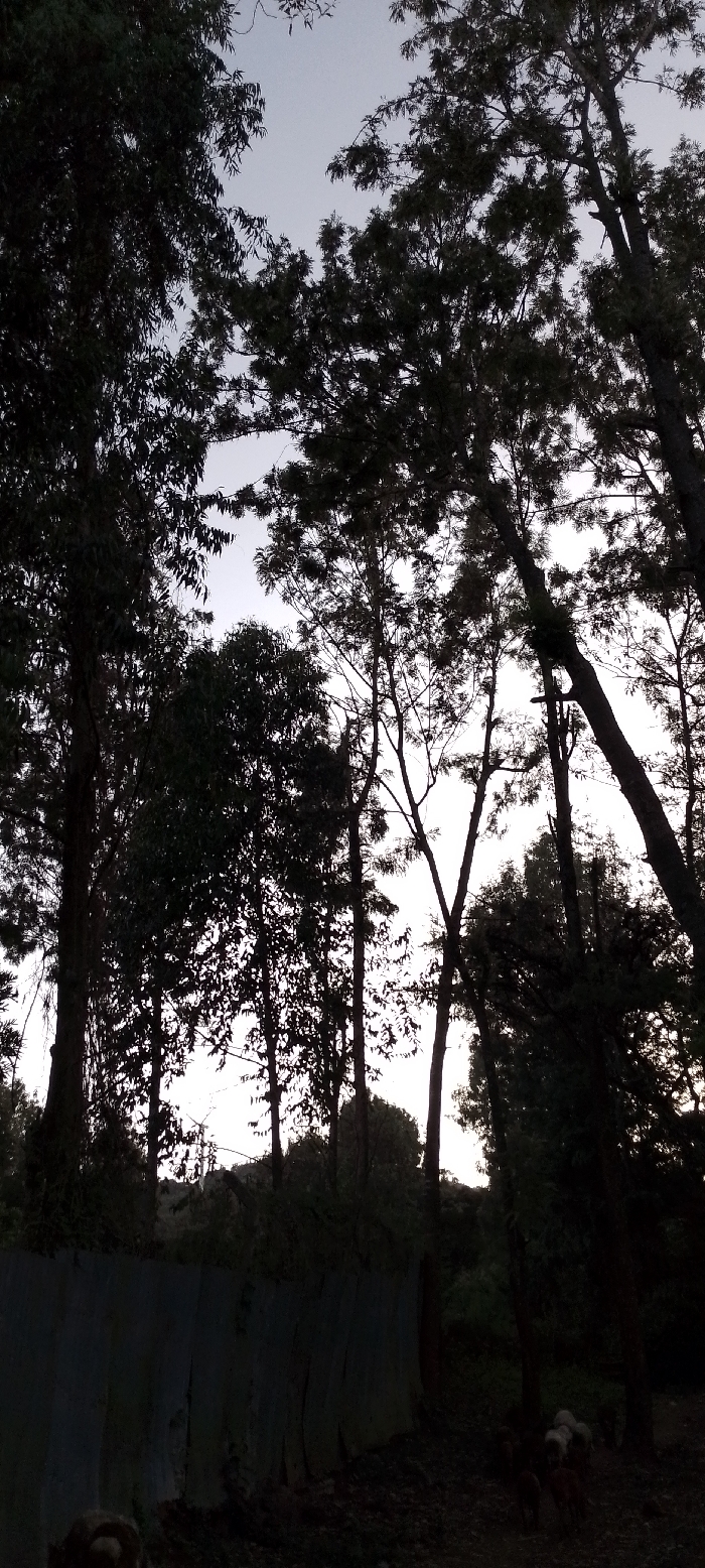 Silhouetted trees reach toward a pale sky. A dark fence stretches across the bottom half of the frame, partially obscured by foliage. In the foreground, indistinct shapes, possibly animals, gather in the shadows. The scene appears to be taken at twilight, with minimal light filtering through the trees.