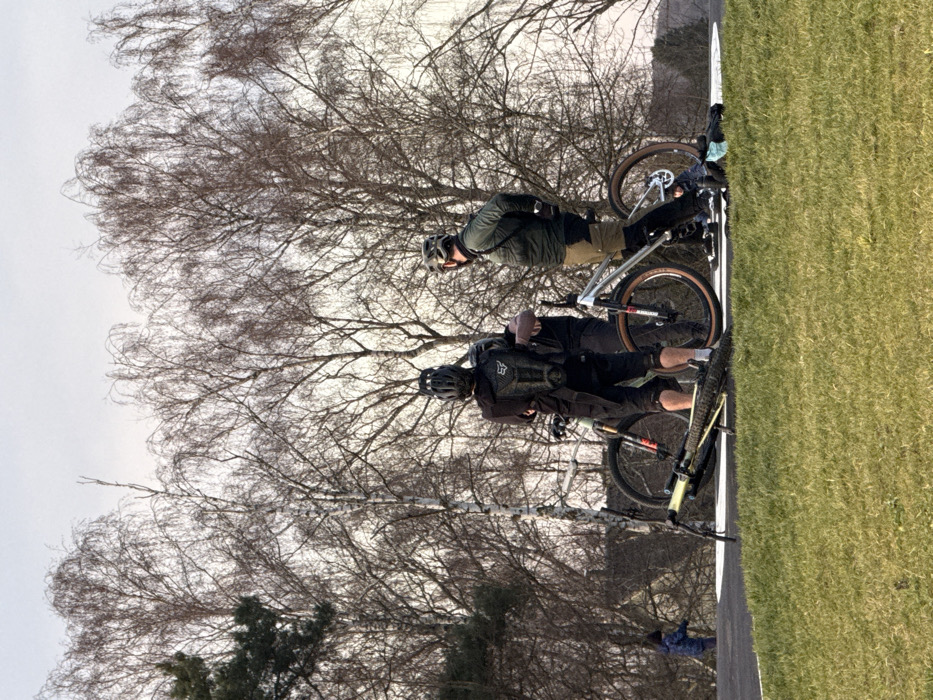 Two cyclists are positioned on a paved surface alongside a grassy area, set against a backdrop of trees with bare branches