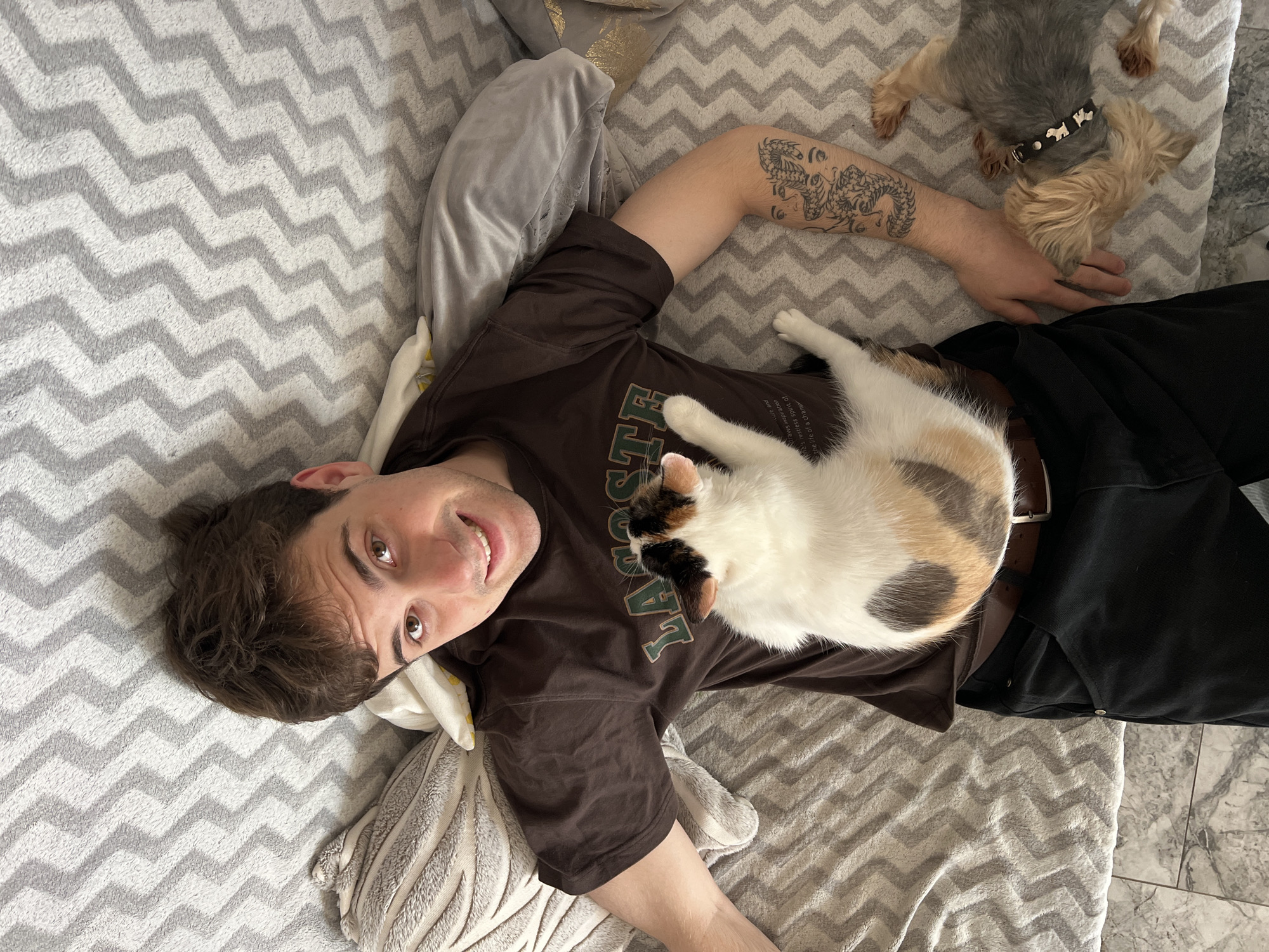A medium shot from above depicts a man lying on a gray patterned bed, covered by the partial form of a cat resting on his chest. The man has short brown hair, brown eyes, and a smile. He is wearing a brown t-shirt. A brown belt is visible around his waist. He wears black pants. His left arm is extended, revealing a tattoo. At the top right corner, a small dog is visible. A gray pillow with a gold accent is next to his head. The location is Rossiyskiy, Russia. The floor is tiled with gray stone.