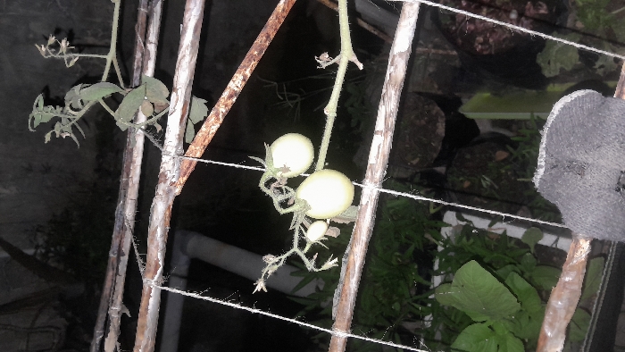 A plant with green tomatoes is growing through a rusty metal trellis. Several unripe tomatoes hang on a vine, surrounded by budding blossoms. The plant is tied to the trellis with string. In the background, there are potted plants and other greenery. Part of a grey glove is visible on the right side of the frame. The light is low.