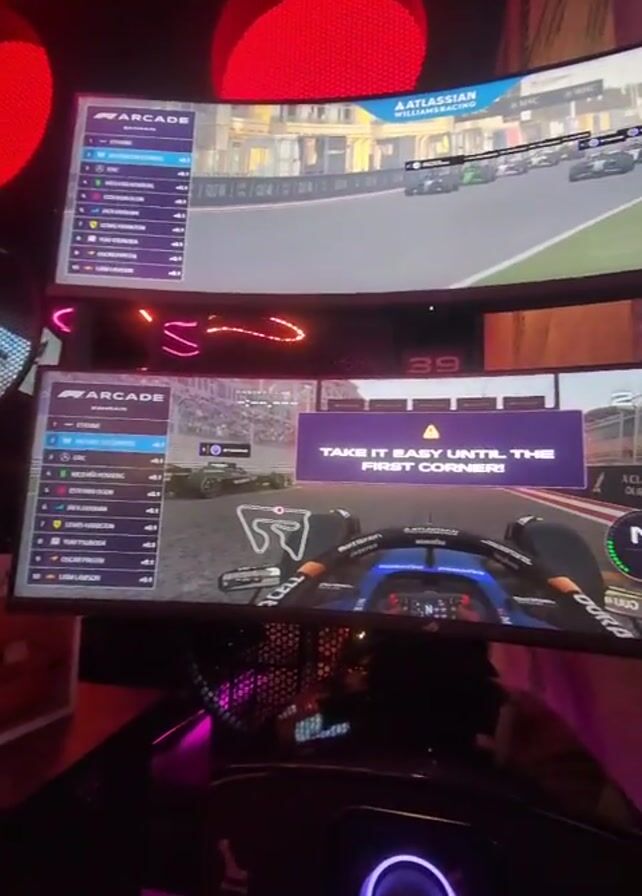 someone using a racing simulator. The simulator has three curved screens displaying the game and leaderboards. A steering wheel with purple lighting and several buttons is in front of the player. Text on the screen reads "Take it easy until the first corner!" and "Next race 06:03". The environment appears to be an arcade or entertainment venue, with red lighting and a bar visible in the background. The camera moves slightly, showing more of the bar area with purple and orange lighting. A QR code is also visible on one of the screens.