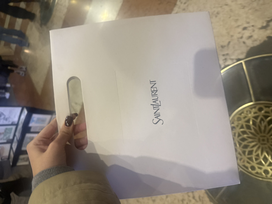 A hand, adorned with dark maroon nail polish, grips the cutout handle of a white Saint Laurent shopping bag