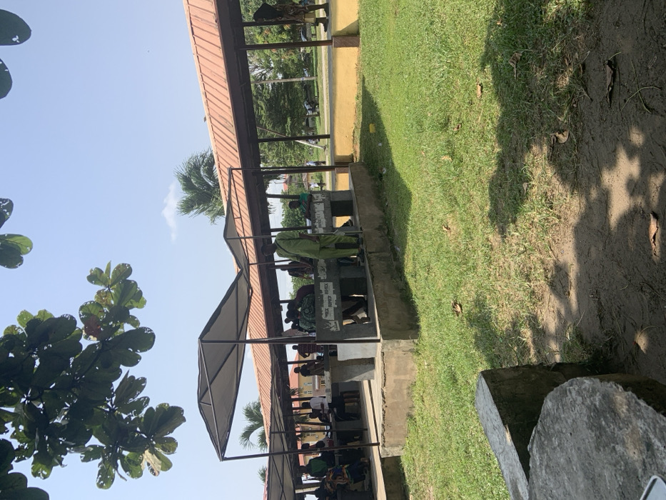 This image depicts an outdoor gathering area in Ijanikin, Nigeria, under a clear blue sky