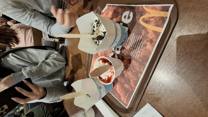 Two people sit at a table. In front of them are two ice cream desserts, one with chocolate cookie pieces and the other with strawberry topping. Both desserts are served in white paper cups with wooden spoons. The desserts are on a brown tray with a McDonald's advertisement. One person is holding a smartphone. The table is brown and textured.