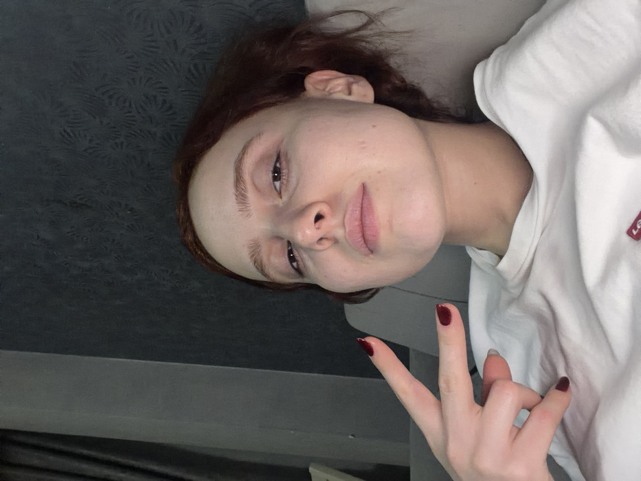 A fair-skinned person with red hair lies on a patterned gray surface. They face the camera, making a peace sign with their right hand, displaying dark red painted nails. They wear a white shirt with a visible red Levi's logo patch. Their expression is neutral with slightly parted lips. The image is taken at an angle, casting shadows on the lower portion of the scene.