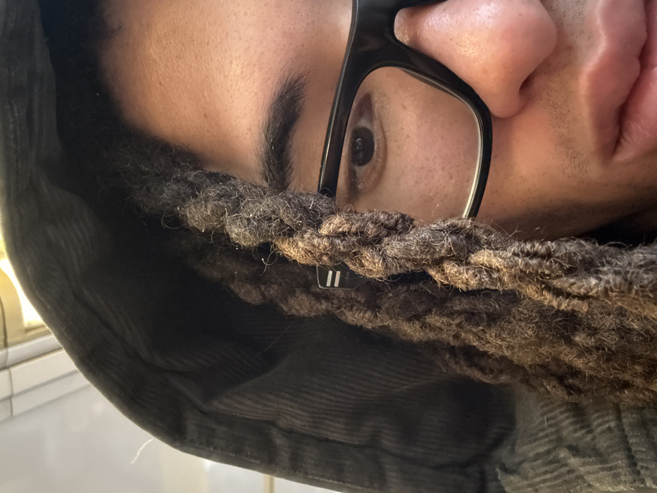 A close-up, tilted view of a person wearing black-rimmed glasses and a dark-colored corduroy hoodie. One eye is visible through the glasses. A thick strand of braided hair rests across the lower part of the face. The person's nose and mouth are partially visible. A window and white tiled wall are barely visible in the background.
