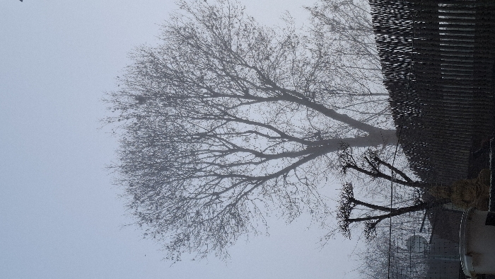 A leafless tree stretches across a misty sky next to a gray, textured building. Smaller trees are silhouetted in the foreground, and a curved structure sits beneath the small trees. The sky is a uniform light gray, obscuring details in the distance. The tree's branches are intricate and detailed against the pale sky.