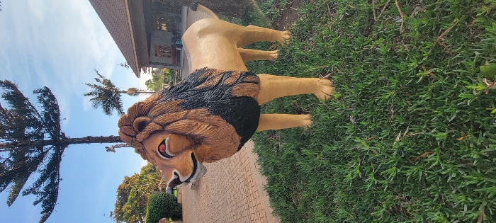 An outdoor scene in Rhotia, Tanzania, features a life-sized statue of a male lion positioned on a patch of short, green, succulent-like ground cover