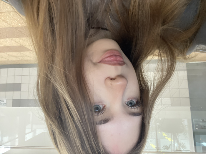 The scene depicts a close-up image of a single female subject in an indoor public space within Raanana, Israel. The subject, positioned centrally and looking forward, is a young female with fair skin, long light brown hair, and blue eyes. A faint red mark is visible on her forehead. She has a small gold hoop nose ring in her right nostril. Her mouth is slightly open, with the tip of her tongue protruding just past her lower lip. She is wearing a dark, possibly grey, top and a thin black choker necklace. The background to the subject's left features a large reflective surface, likely glass, displaying blurred ambient light and indistinct shapes. To her right, a wall composed of white square tiles with a horizontal grey stripe is visible. Affixed to this wall is a white rectangular sign with illegible black text and a downward-pointing arrow. The floor in the lower right portion of the image is comprised of light-colored tiles.