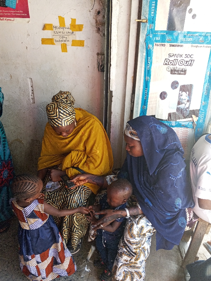 The image captures an indoor or semi-enclosed setting in Fagge C, Nigeria, featuring four individuals amidst a utilitarian environment. On the left, a woman in a gold-yellow garment and a geometric patterned headscarf is seated, looking down at a small black feature phone held in her hands. To her right, another woman, wearing a dark blue hijab with light blue floral patterns and displaying intricate dark patterns on her forearms and hands, is also seated and looking downwards. Between these two women, a young boy in a dark blue patterned outfit is seated on the ground, seemingly interacting with his hands. A young girl with braided hair and a multi-patterned dress stands in the left foreground, extending her left hand towards the boy. The background wall is light-colored and exhibits wear. On the left wall, a hash symbol formed by yellow adhesive tape displays handwritten text: "MONTOPoint" and two phone numbers, "5300312940" and "7060803020," with "Dpay" written below. A partial red-bordered poster is also visible on this wall. The right side of the scene features a large "TECNO SPARK 30C Roll Out!" advertisement poster, displaying images of mobile phones and text including "TECNO TRANSFORMERS Google on Android." A person in a white t-shirt is partially visible on the far right, seated on a simple wooden stool. The ground is a light-colored surface.