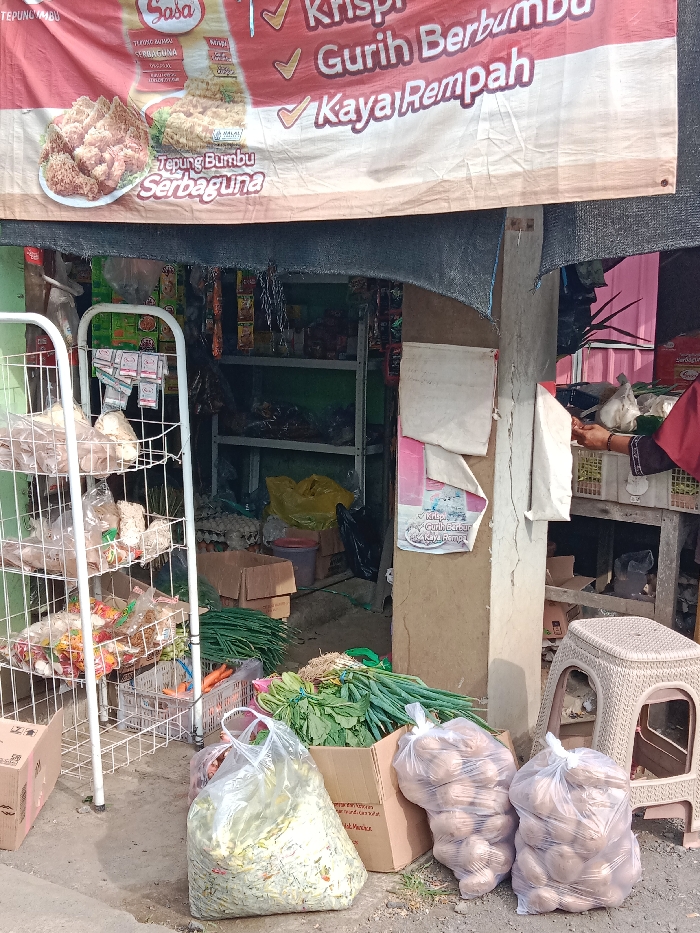 This is a roadside vendor selling vegetables and food ingredients. A banner for "Sasa Tepung Bumbu Serbaguna," a seasoning flour, hangs above. The vendor displays produce like green onions, carrots, and potatoes in plastic bags and containers. Shelves inside the stall hold various packaged goods. A white metal rack displays bagged food items. A plastic stool is positioned near the potatoes, suggesting a place for the vendor or customers.