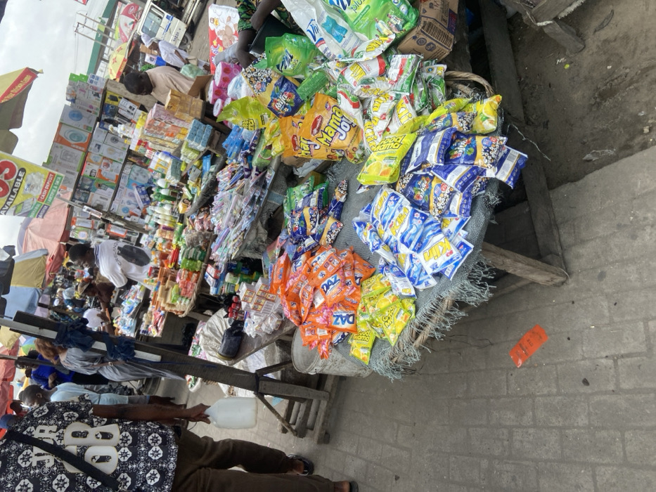 The image displays a bustling outdoor market scene located in Alasia, Nigeria