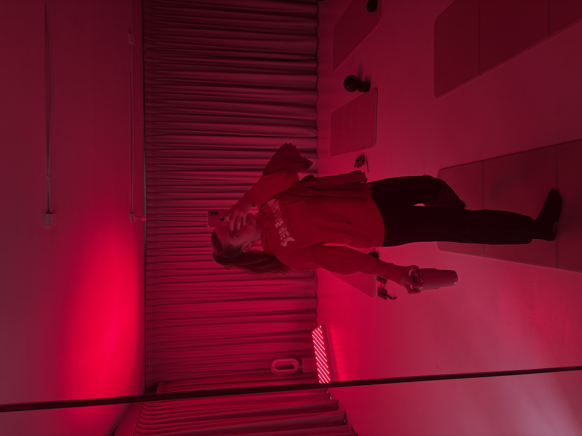 A red-lit room appears to be in Mexico City, Mexico. A person with dark pants and a red top is holding a hair dryer and a phone and is standing in the room. There are fitness mats visible on the floor of the room and in the background. There are also curtains hanging near the back.