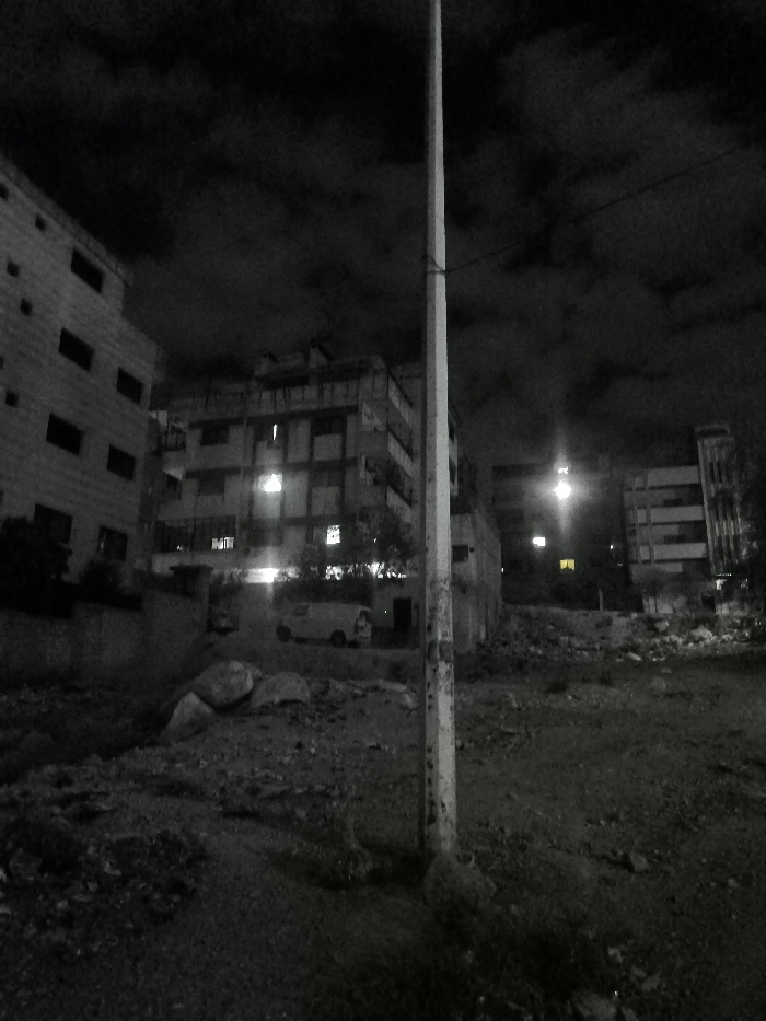 An urban scene at night shows several buildings with lit windows. A tall, thin pole stands prominently in the foreground, slightly off-center. A van is parked near one of the buildings. The ground appears uneven and somewhat barren. Clouds fill the night sky, adding a sense of depth. The overall lighting is dim, creating a shadowy atmosphere.