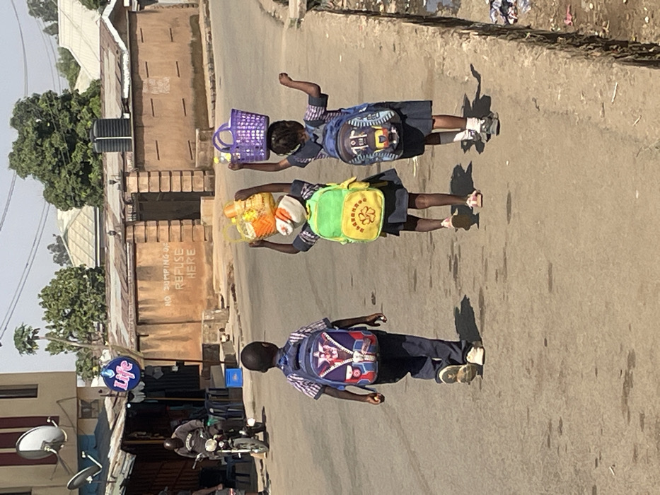 The image depicts an outdoor street scene in Jos, Nigeria, under bright daylight. In the foreground, three children, wearing school uniforms, walk away from the camera on an asphalt road. The leftmost child, a boy, wears a plaid-patterned blue shirt, dark trousers, and a blue backpack featuring a large zipper design. He wears white and black sneakers. To his right, two girls, similarly dressed in plaid-patterned blue shirts and dark skirts, carry items on their heads. The middle girl wears a light green backpack with a yellow floral emblem, a white head covering, and pink sandals; she balances a yellow woven basket filled with various packaged items, including bottles, on her head. The girl on the right wears a blue backpack with a truck design, white socks, and dark sneakers; she balances a purple plastic woven basket on her head. In the mid-ground to the left, an adult male sits on a motorcycle parked in front of a building with a corrugated metal roof. This building also features two satellite dishes and a blue circular "Life" beer sign. What appears to be a market stall or shop is visible adjacent to the building. Further right in the mid-ground, a light brown plastered wall displays the white painted inscription "NO DUMPING OF REFUSE HERE" to the left of a dark, recessed gateway. Beyond this wall, additional buildings with corrugated metal roofs and a black water tank on a stand are visible, interspersed with green trees. The right side of the street features an elevated concrete curb or drainage channel containing some debris. Shadows are cast distinctly on the ground, indicating a high sun position.