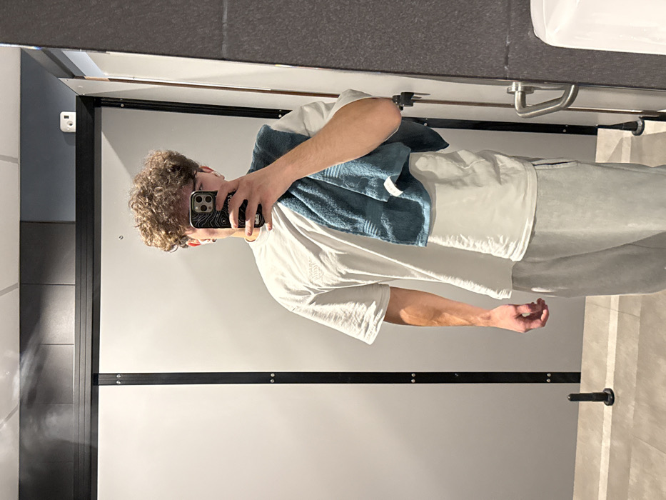 - "The image displays a young adult male taking a mirror selfie within a public restroom or changing facility, located in the city of Chantepie, France" by FM-DALdZ2, licensed under CC BY 4.0