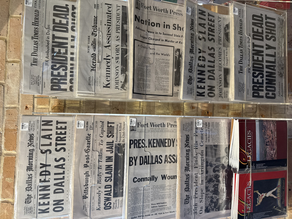 A display of historical newspapers commemorates President Kennedy's assassination. Headlines proclaim "President Dead", "Kennedy Assassinated", and "Kennedy Slain on Dallas Street". Articles detail Johnson's succession, Oswald's capture and death, and the nation's grief. Front pages from the Dallas Morning News, Fort Worth Press, New York Herald Tribune, and Pittsburgh Post-Gazette are featured. Some editions include coverage of the funeral and Kennedy's burial at Arlington Cemetery. Copies of "Legacies" books are also available.