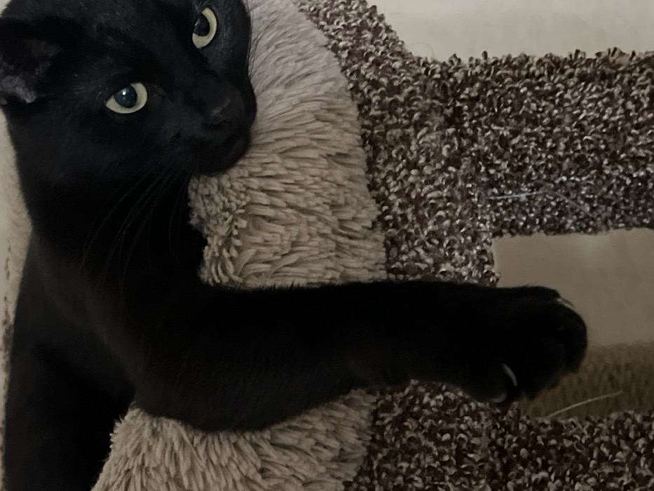 - "A black domestic cat is observed resting on a multi-tiered cat tree within an indoor environment in Lobnya, Russia" by FM-BcfNf1, licensed under CC BY 4.0