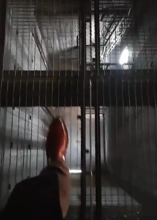 first-person view of someone standing on a metal grate, looking down into a deep shaft or open space. The person is wearing red shoes. The shaft is enclosed by concrete walls and there are some structural elements visible inside, including ladders or scaffolding. The lighting inside the shaft is dim, but there are some light sources illuminating the scene. The metal grate creates a visual barrier and adds to the depth of field.