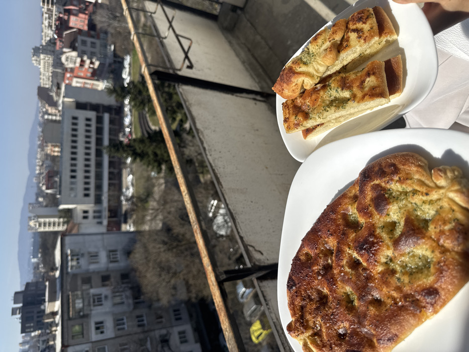 The image depicts a high-angle view from a residential balcony in Sofia, Bulgaria, specifically looking out from a neighborhood such as Izgrev or Dianabad towards the city. In the immediate foreground, two white plates hold baked bread items. The left plate contains a large, irregularly shaped focaccia-like bread, golden brown with visible green herbs and indentations. The right plate, partially held by a hand, contains several smaller, rectangular breadsticks, also golden brown and topped with herbs. The food is brightly illuminated by direct sunlight, casting shadows. Beyond the food, a weathered metal railing, rusted and concrete balcony edge frame the view of an urban landscape under a clear blue sky with a distant hazy horizon. The midground features various buildings: an older, grey multi-story residential block on the left, a larger rectangular building with numerous windows in the center, and buildings with red and pink facades further right. Below the buildings, leafless deciduous trees and several evergreen conifers are visible alongside a curved paved path or road, with multiple parked cars. In the distant background, a distinctive white tower structure, identifiable as part of the Bulgarian National Radio building, rises above the city skyline, with hills or mountains faintly visible beyond.