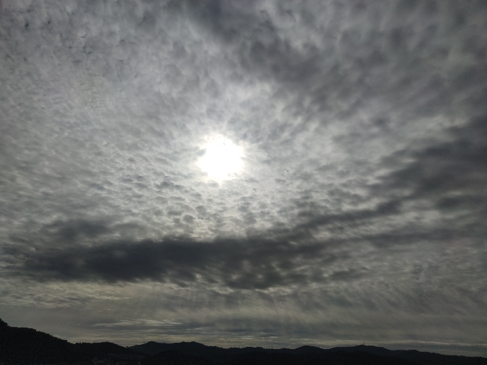 The image displays an expansive vista of an overcast sky above a distant, undulating terrestrial landscape, observed from the city of Ripollet, Spain. The upper two-thirds of the frame are dominated by a dense formation of textured grey clouds, characteristic of altocumulus, exhibiting a mottled pattern with varying light and dark grey tones. The sun is visible as a bright, diffuse white orb through a thinner section of clouds in the upper-center-left, creating a central glare. Below this, a darker, elongated stratum of clouds extends horizontally across the mid-sky. The lower third of the image features a dark, indistinct silhouette of multiple layers of distant hills or mountains along the horizon. A faint, slender structure, possibly a telecommunications tower, is discernible on one of the distant peaks towards the right. No individuals, specific objects in the immediate foreground, or active events are depicted.