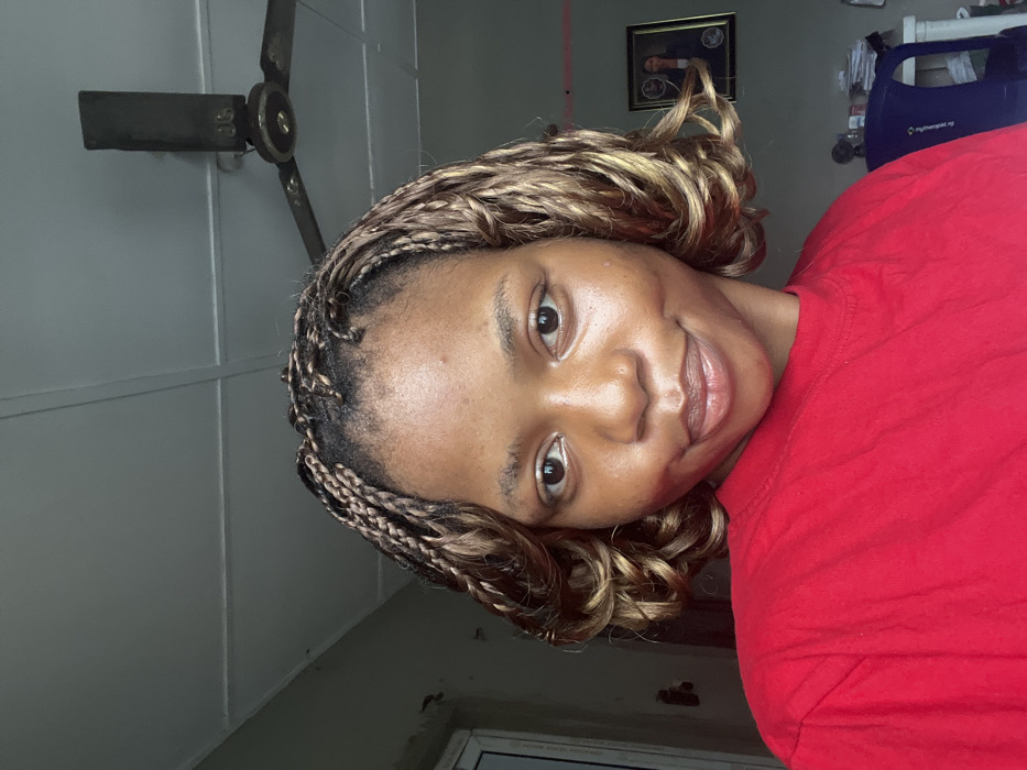 An individual female, exhibiting a medium-brown complexion, occupies the foreground, looking directly at the viewer with a slight smile. She has braided hair with lighter brown/blonde highlights styled in curls, reaching just above her shoulders, and a small stud piercing in her right nostril. She is wearing a plain red short-sleeved t-shirt. The background is an indoor environment. A light-colored ceiling with visible panels features a dark, stationary three-blade ceiling fan. The walls are light grey. To the subject's left, a white door or window frame is partially visible next to an unpainted or discolored section of the wall. To the subject's right, a framed picture of an individual hangs on the wall, below which a desk or table is visible, cluttered with stacked papers, a blue office chair, and a small fan. The scene is located indoors within a city setting, specifically in Lagos, Nigeria.