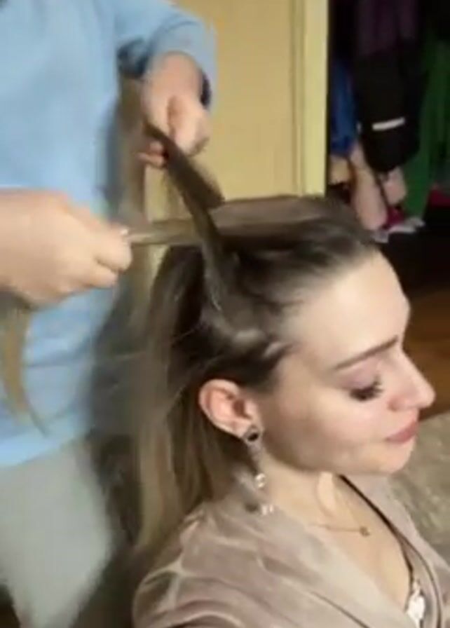 A child is braiding a woman's hair. The child wears glasses and a long-sleeved blue shirt with gray sweatpants. The woman is wearing a light brown robe with a white lace top and has dangling earrings and a necklace. The room appears to be a bedroom, with a closet visible in the background. The child stands behind the woman, dividing and braiding the hair. Background music can be heard.