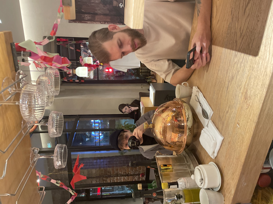 A man with a beard looks at his phone at a wooden bar. A younger person in a beanie holds a camera, seemingly taking a photo of a large copper bowl. Behind them, another person sits at a table. Wine glasses hang above the bar near paper decorations. A white mug, silverware, and a serving tray with condiments are on the bar. Bottles of liquor are visible below the copper bowl.