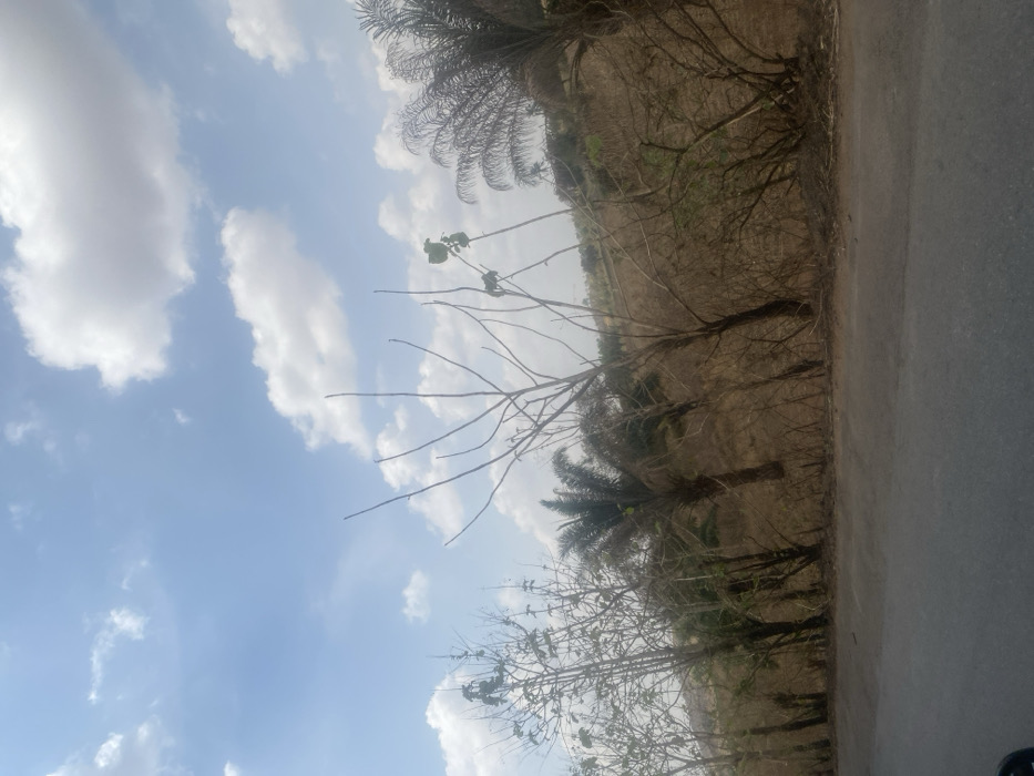 The image depicts a rural landscape scene in Nandu, Nigeria, under a bright, partly cloudy blue sky. In the foreground, a dark gray paved road surface occupies the lower portion of the frame, extending horizontally. Above the road, a line of various trees and shrubs is visible, separating the road from a sloping hillside. The vegetation consists of several deciduous trees, many of which are bare or have sparse green foliage, indicative of a dry season. Interspersed among these are several palm trees with dense green fronds. Behind the trees, the ground rises as a hillside covered predominantly with dry, brown, and sparse vegetation. No individuals, animals, or specific objects are identifiable within the scene beyond the natural environment and road. The overall impression is one of a sunlit, dry climate.