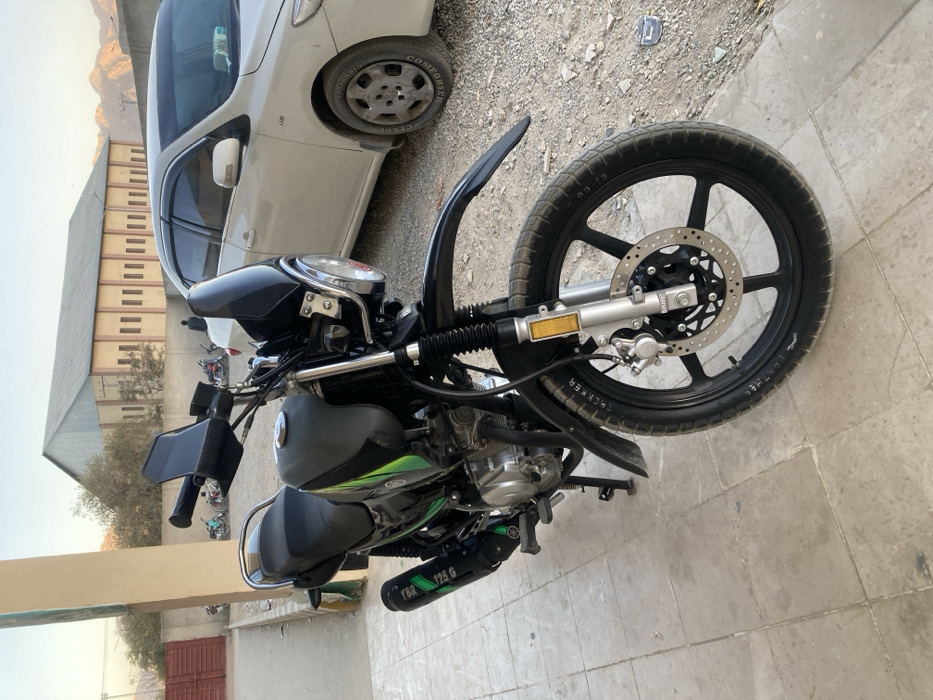 The scene is located in Quetta City Tehsil, Pakistan. A black Yamaha YBR 125 G motorcycle, identifiable by text on its exhaust, is parked in the foreground on a light-colored tiled concrete surface, supported by its kickstand. The motorcycle has a black fuel tank with green accents, a black seat, black multi-spoke alloy wheels, knobby tires (with "TRACKER" visible on the front tire sidewall), a front disc brake, a high-mounted front fender, a small tinted windscreen, and black handguards. To the right, a white Toyota Corolla sedan is parked on a dirt and gravel lot. In the mid-ground, a single individual is visible as a dark silhouette, standing near the white sedan and several other motorcycles parked along a wall. The background includes a large, light-colored industrial-style building with a corrugated metal roof and numerous rectangular windows. A reddish-brown metal gate is partially visible on the far left. Arid mountains are present in the distant background under a clear sky.