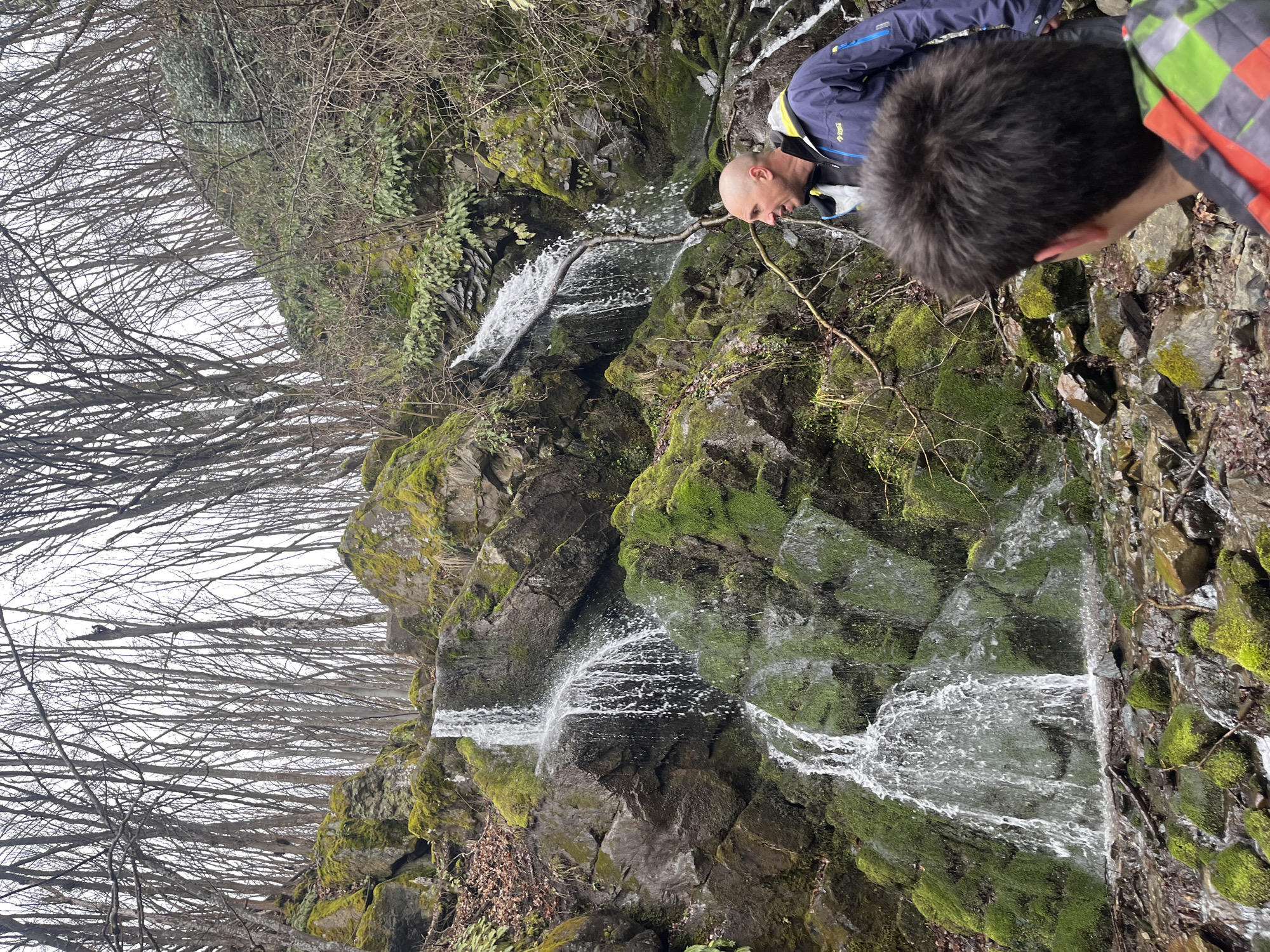 Two individuals are present near a small waterfall. One person, identifiable as male with a bald head, is bending over, appearing to drink directly from the waterfall. The second person, only partially visible, appears to be observing. The waterfall cascades down a rocky surface covered in moss. Leafless trees frame the backdrop, suggesting a late autumn or winter setting. The location is near Sofia, Bulgaria, based on the presence of specific moss species and the rock formations.