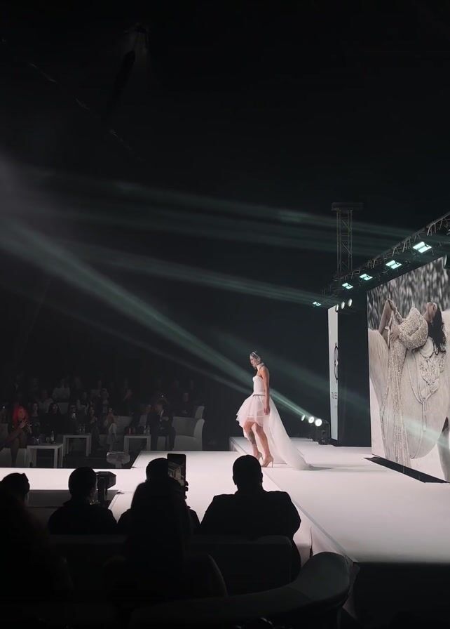 A model walks down a runway during a fashion show. She wears a short white dress with a long train and high heels. Spotlights shine on her as she moves, and a screen behind her displays an image of another model with a blindfold on. The audience watches from their seats. There is a metal support structure visible at the top of the frame.