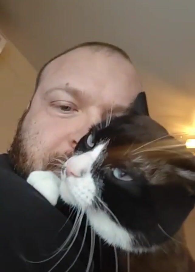 A man is holding a cat in his arms, with the cat's head pressed against his face. The man is fair-skinned, with a beard and a bald head. He's wearing a black shirt. The cat is a black and white tuxedo cat with blue eyes. The background is a room with off-white walls and a light fixture on the ceiling. The video is shot at a close range. The cat seems to be purring or making a rumbling sound.